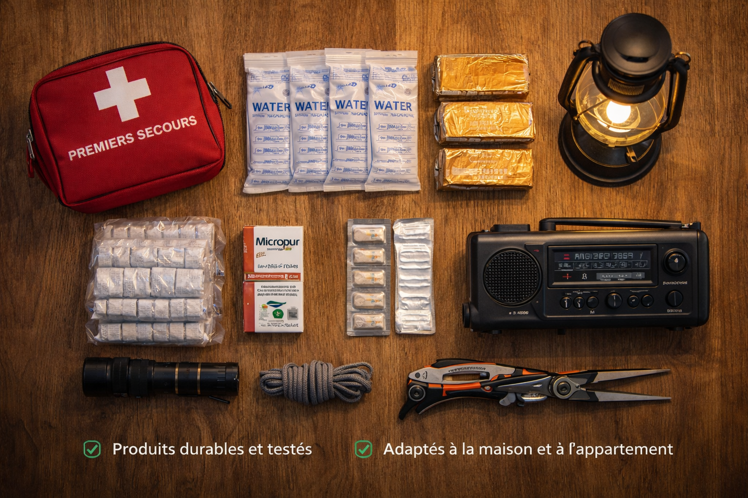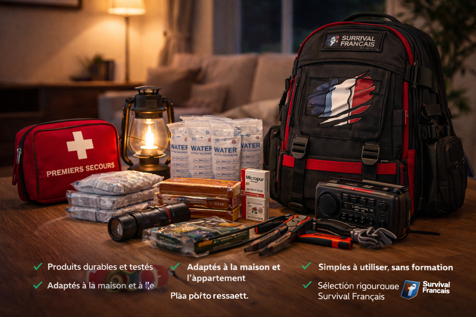 Nos kits de survie intérieure 72h contiennent l’essentiel pour protéger votre foyer et tenir plusieurs jours à domicile, sans improvisation ni stress.